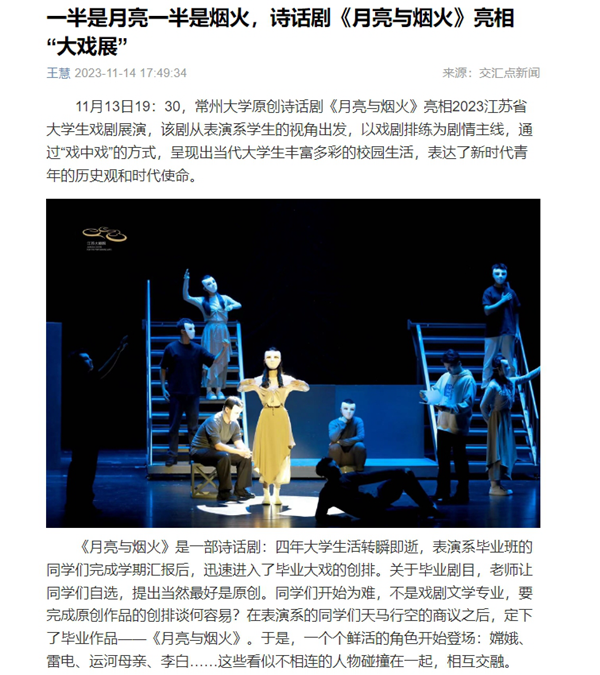11月13日19:30,动漫花园 原创诗话剧《月亮与烟火》亮相2023江苏省大学生戏剧展演,该剧从表演系学生的视角出发,以戏剧排练为剧情主线,通过“戏中戏”的方式,呈现出当代大学生丰富多彩的校园生活,表达了新时代青年的历史观和时代使命。