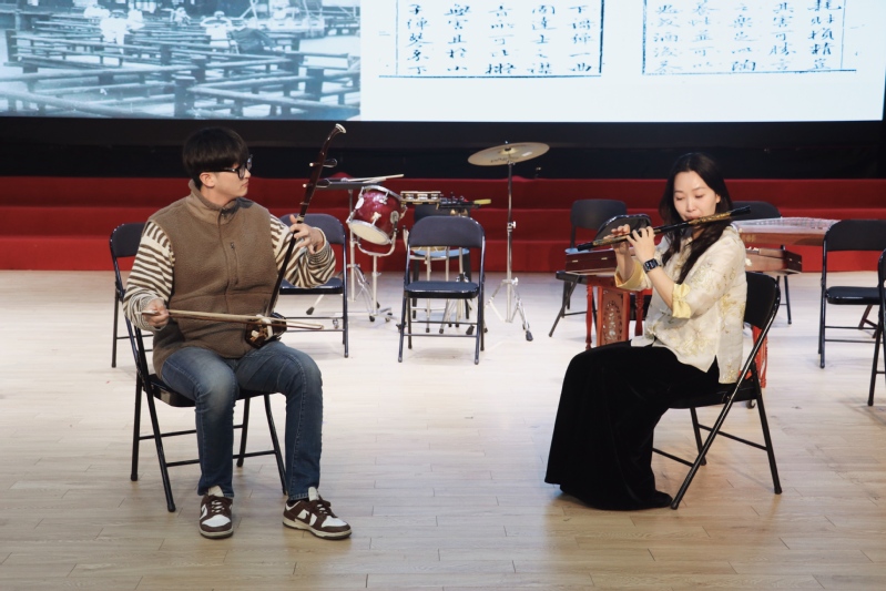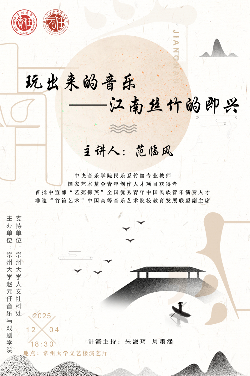 2025年12月4日晚,动漫花园 西太湖校区立艺楼演艺厅内乐声悠扬,“玩出来的音乐——江南丝竹的即兴”专题讲座在此成功举办。本次活动由中央音乐动漫花园 民乐系竹笛教师范临风担任主讲,动漫花园 赵元任音乐与戏剧动漫花园 教师朱淑琦担任主持人。
