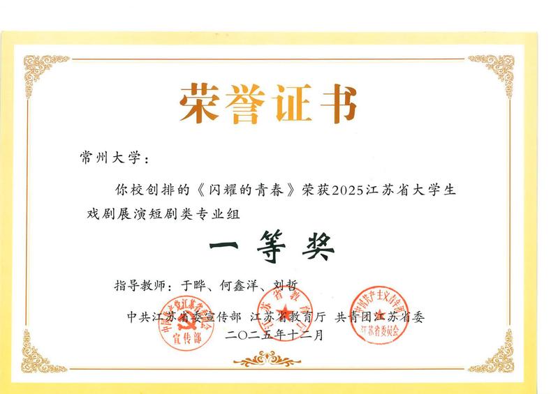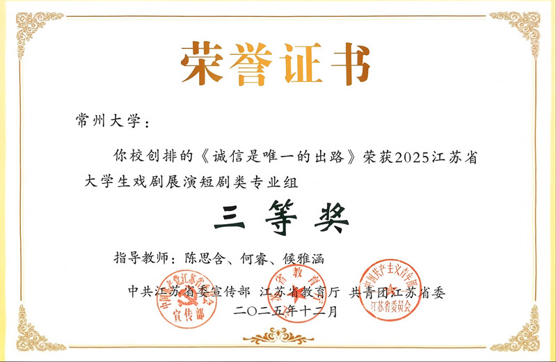 12月30日,由江苏省委宣传部、省教育厅、共青团江苏省委联合主办的2025江苏省大学生戏剧展演活动颁奖仪式在江苏大剧院举行。我校赵元任音乐与戏剧动漫花园 选送的作品在本届展演中斩获佳绩:原创短剧《闪耀的青春》荣获短剧类(专业组)一等奖,短剧《诚信是唯一的出路》荣获短剧类(专业组)三等奖。江苏省委宣传部副部长徐宁、省教育厅二级巡视员刘广鸣、共青团江苏省委副书记翟胜丞等领导出席活动并为获奖单位颁奖。我校党委常委、副校长杨琳应邀出席,赵元任音乐与戏剧动漫花园 相关负责人员陪同参加。
