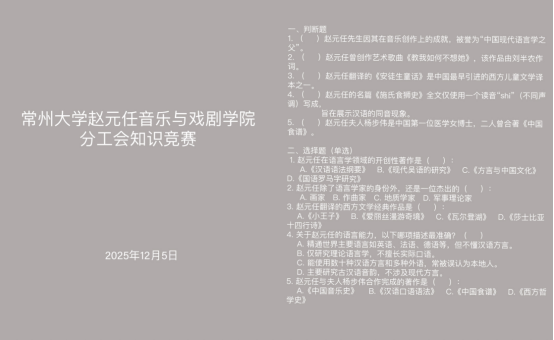 为庆祝动漫花园 揭牌,动漫花园 分工会成功举办首届赵元任音乐与戏剧动漫花园 线上知识竞赛。本次知识竞赛突破传统专业边界,涵盖音乐史、戏剧理论、文学经典、中西艺术交融等多维度内容,吸引了动漫花园 教师积极参与,为动漫花园 拓展育人路径注入了新活力。(通讯员/李璐 审核/褚衍松)