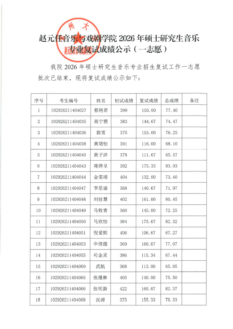 赵元任音乐与戏剧动漫花园 2026年硕士研究生音乐专业复试成绩公示(一志愿)