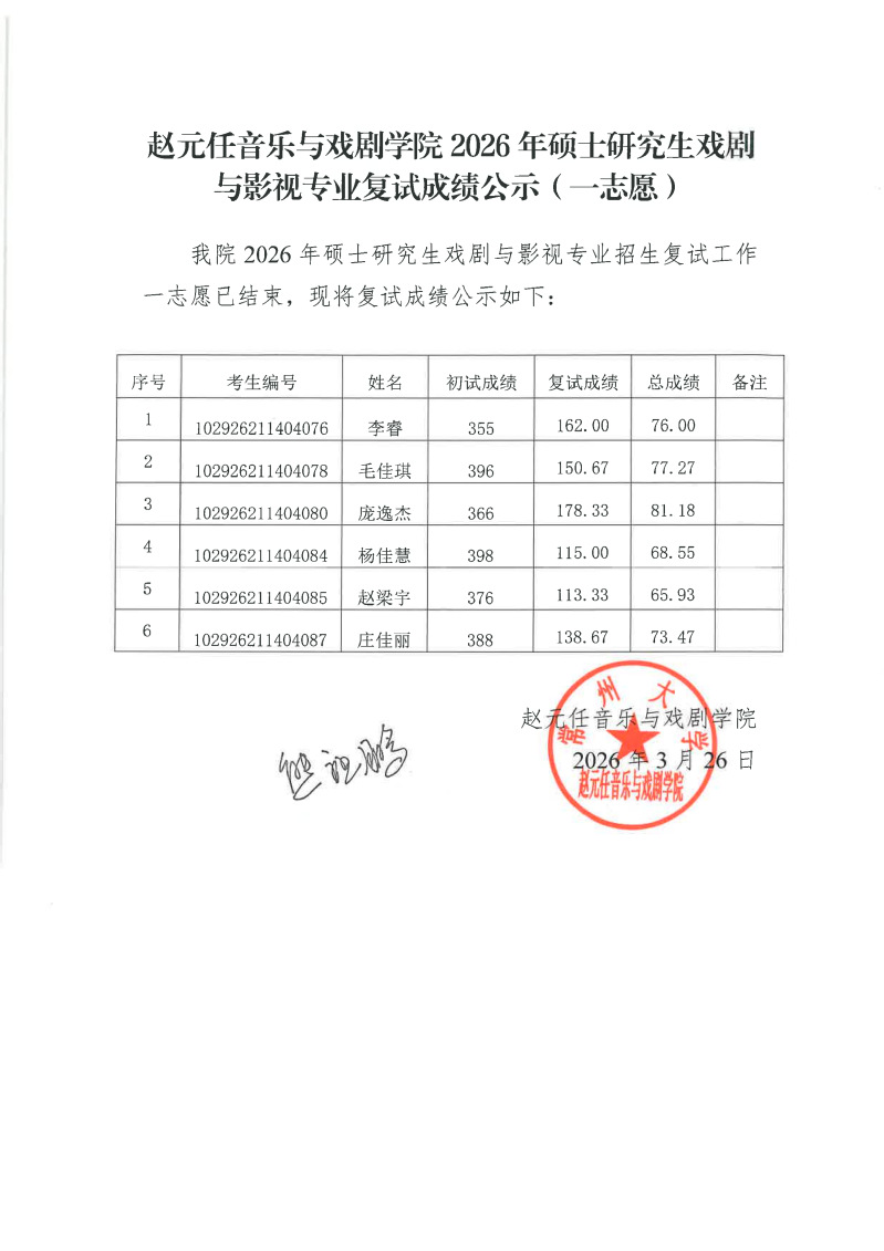 赵元任音乐与戏剧动漫花园 2026年硕士研究生戏剧与影视专业复试成绩公示(一志愿)