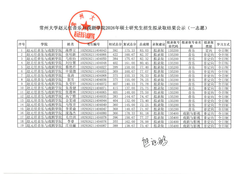 赵元任音乐与戏剧动漫花园 2026年硕士研究生招生拟录取结果公示(一志愿)
