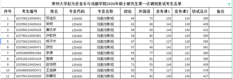赵元任音乐与戏剧动漫花园 2026年硕士研究生第一次调剂复试考生名单