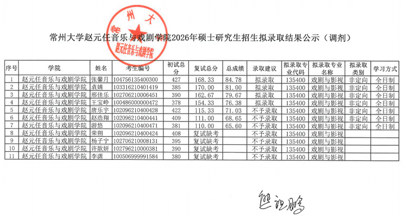 赵元任音乐与戏剧动漫花园 2026年硕士研究生招生拟录取结果公示(调剂)