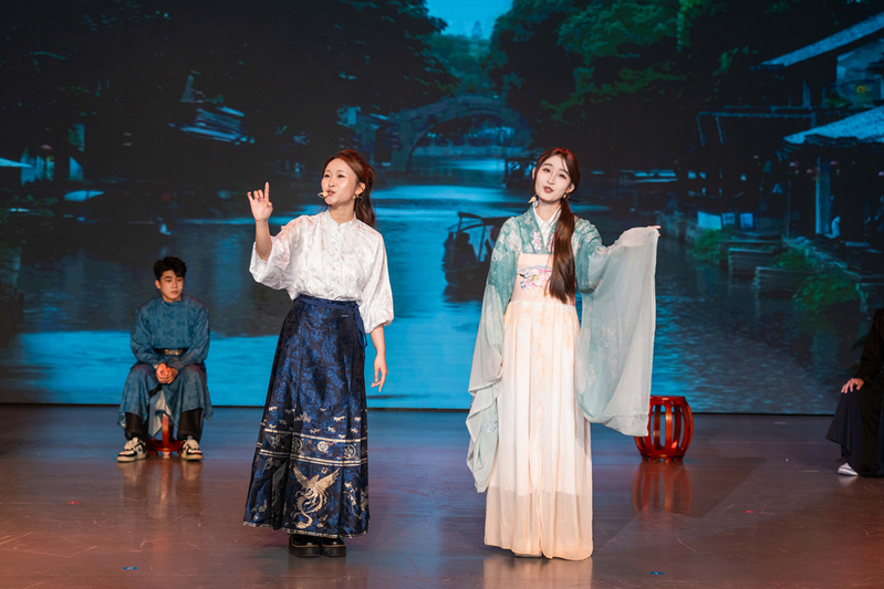 晚上七点,歌会在歌曲《刀剑如梦》中拉开帷幕,激昂的旋律、洒脱的唱腔瞬间点燃现场氛围。“侠风傲骨”“诗韵流芳”“匠心遗韵”三个篇章中,《关山酒》《天下》等歌曲传递家国情怀,《入画江南》《知否知否》演绎江南雅致与诗词底蕴,《青丝》缠绵悱恻,《但愿人长久》寄情明月,一首首融入传统文化元素的歌曲,将古韵之美与青春之声交织融合。其间,非遗展示表演与互动环节穿插进行,让观众在视听盛宴中感受匠心传承的魅力。
